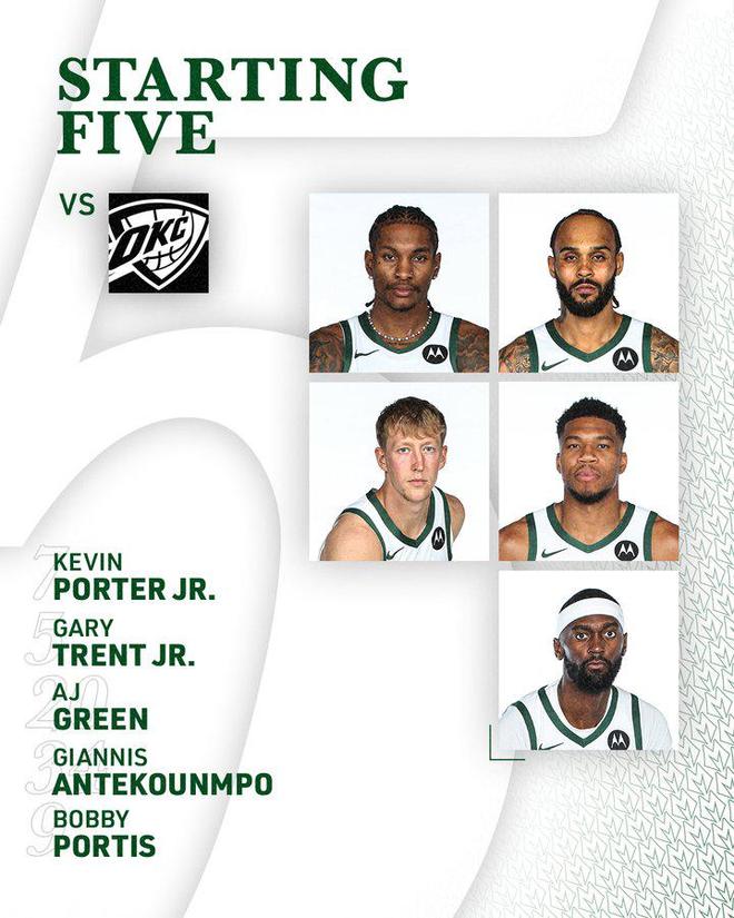 雄鹿vs雷霆首发:字母哥PK亚历山大,卡鲁索&多尔特出战